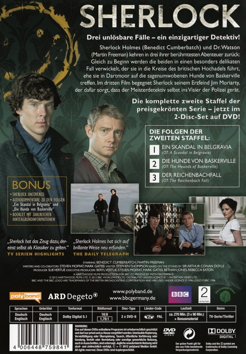 Sherlock Holmes (Benedict Cumerbatch) und Dr. Watson (Martin Freeman) kehren in drei ihrer berühmtesten Abenteuer zurück: Gleich zu Beginn werden die beiden in einen besonders delikaten Fall verwickelt, der sie in die Kreise des britischen Hochadels führt, ehe sie in Dartmoor auf die sagenumwobenen Hunde von Baskerville treffen. Im dritten Fall begegnet Sherlock seinem Erzfeind Jim Moriarty, der dafür sorgt, dass der Meisterdetektiv selbst ins Visier der Polizei gerät.