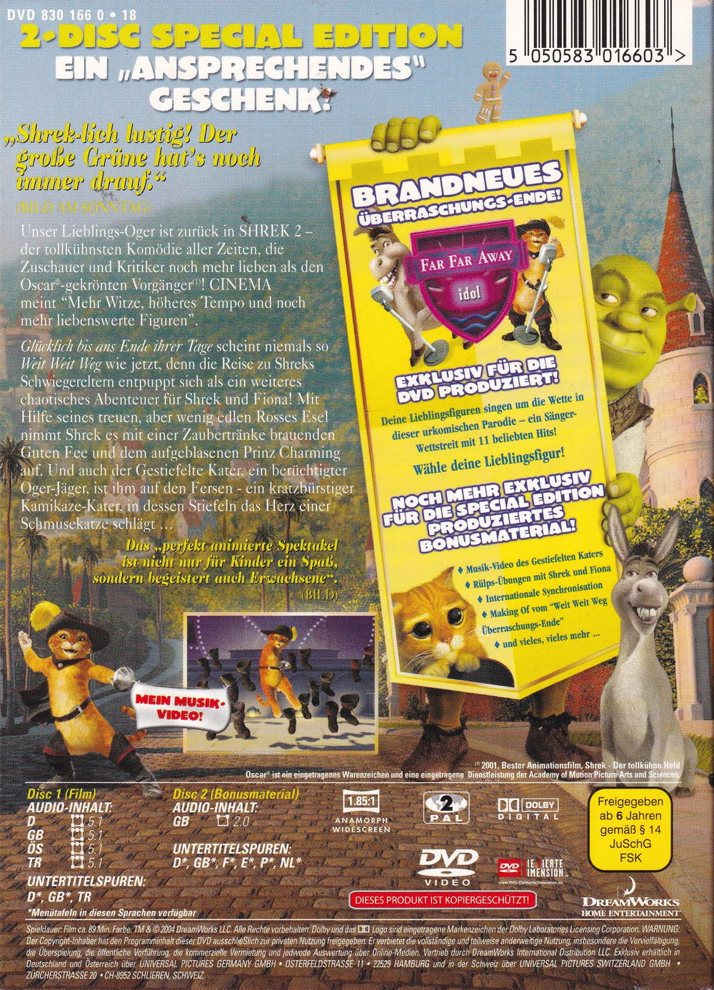 Mit Hilfe seines treuen, aber wenig edlen Rosses Esel nimmt Shrek es mit einer Zaubertränke brauenden Guten Fee und dem aufgeblasenen Prinz Charming auf. Und auch der Gestiefelte Kater, ein berüchtigter Oger-Jäger, ist ihm auf den Fersen - ein kratzbürstiger Kamikaze-Kater, in dessen Stiefeln das Herz einer Schmusekatze schlägt...