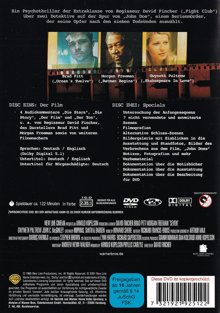 Bei der Jagd auf einen Ritualmörder werden zwei Detectives - Routinier Somerset (Morgan Freeman) und Hitzkopf Mill (Brad Pitt) - vor die härteste Zerreissprobe ihrer Laufbahn gestellt. Es scheint ihnen nicht nur der brutal-brilliante Killer, der seine Opfer nach dem Prinzip der sieben Todsünden hinrichtet, stets einen Schritt voraus zu sein, sondern der Fall droht auch ihre Existenz zu zerstören...
