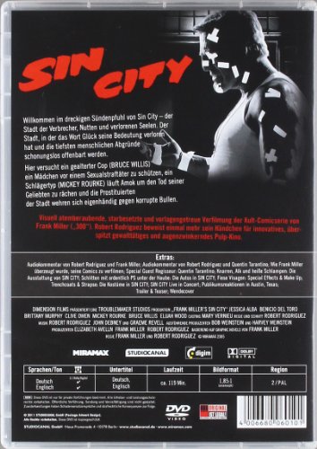 Willkommen in Sin City! Diese Stadt begrüsst die Harten, die Korrupten, die mit den gebrochenen Herzen. Einer von ihnen ist Marv ein riesiger Schlägertyp, der für eine einzige Nacht das Glück in den Armen einer Frau findet. Am Morgen liegt sie ermordet neben ihm und Marv sinnt auf Rache um jeden Preis. DwightsProblem ist Jackie Boy der psychopathische Ex-Lover seiner Geliebten, den er aufhalten muss. Für John Hartigan bleibt nur noch eine Stunde, bis der letzte aufrichtige Cop von Sin City seine Marke abgibt. Doch davor gilt es noch, ein kleines Mädchen aus den Fängen eines Perversen zu retten und ihm die Waffen abzunehmen alle Waffen.