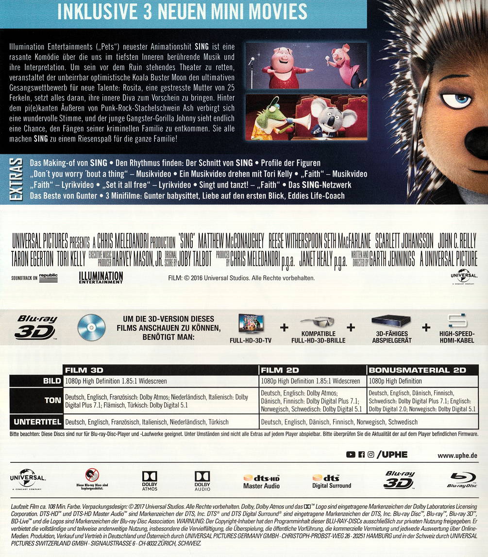 Die kunterbunte Welt von Sing wird ausschliesslich von liebenswerten Tiercharakteren bevölkert, wie dem vornehmen Koala Buster Moon, dessen früher so schillerndes Theater kurz vor dem Ruin steht. Doch Buster ist ein ewiger Optimist, besser gesagt: ein echtes Schlitzohr, der einfach alles tun würde, um sein Lebenswerk zu retten. Deshalb nutzt er seine letzte Chance und veranstaltet die tierischste Casting-Show, die die Welt je gesehen hat. Unter den Wettbewerbern stechen fantastische Supertalente heraus: u.a. die Maus, die zuckersüss singt, es aber faustdick hinter den Ohren hat, das schüchterne Elefanten-Mädchen, dem auf der Bühne die Knie schlottern, die gestresste Mutter, der 25 kleine Ferkel am Rockzipfel hängen, der junge Gangster-Gorilla, der die kriminellen Machenschaften seiner Familie hinter sich lassen will, und das Punk-Rock-Stachelschwein, das es nicht länger mit seinem fiesen Freund aushält. Sie alle betreten die Bühne von Busters Theater mit dem gleichen Ziel: zu gewinnen und damit ihr Leben zu verändern.