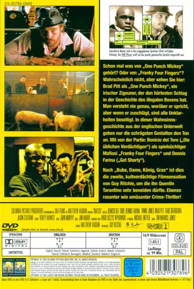 Schon mal was von "One Punch Mickey" gehört? Oder von "Franky Four Fingers"? Wahrscheinlich nicht, aber sehen Sie hier: Brad Pit als "One Punch Mickey", ein irischer Zigeuner, der den härtesten Schlag in der Geschichte des illegalen Boxens hat. Man versteht nie genau, worüber er spricht, aber wenn er zuschlägt, sind alle Unklarheiten beseitigt. In dieser Wahnsinnsgeschichte aus der englischen Unterwelt geben nur die schrägsten Gestalten den Ton an. Mit von der Partie: Benicio del Toro als spielsüchtiger Mafiosi "Franky Four Fingers" und Dennis Farina.