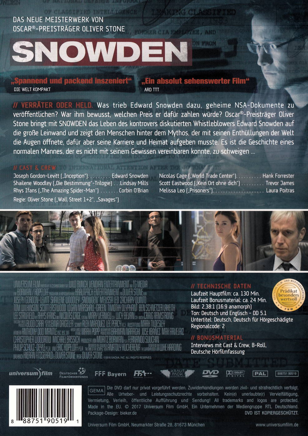 Verräter oder Held. Was trieb Edward Snowden dazu, geheime NSA-Dokumente zu veröffentlichen? War ihm bewusst, welchen Preis er dafür zahlen würde? Oscar-Preisträger Oliver Stone bringt mit SNOWDEN das Leben des kontrovers diskutierten Whistleblowers Edward Snowden auf die grosse Leinwand und zeigt den Menschen hinter dem Mythos, der mit seinen Enthüllungen der Welt die Augen öffnete, dafür aber seine Karriere und Heimat aufgeben musste. Es ist die Geschichte eines normalen Mannes, der es nicht mit seinem Gewissen vereinbaren konnte, zu schweigen...