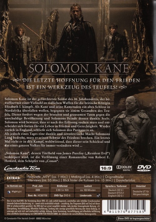 Solomon Kane, ist ein gefürchteter Soldat des 16. Jahrhunderts, bewaffnet mit einem Arsenal an tödlichen Waffen. Wegen seiner brutalen und grausamen Taten gegen seine Feinde macht Kane schliesslich Bekanntschaft mit dem Gesandten des Teufels. Während dieser die dunkle Seele Solomons fordert, entscheidet der sich fortan für ein Leben in Frieden und Gerechtigkeit. Als jedoch eines Tages eine dunkle und zerstörerische Macht Kanes Land bedroht, muss er seinen Schwur des Friedens brechen. Ein letztes Mal zieht er in den Kampf, wohl wissend, dass dieser sein Schicksal und das eines ganzen Volkes für immer verändern wird...