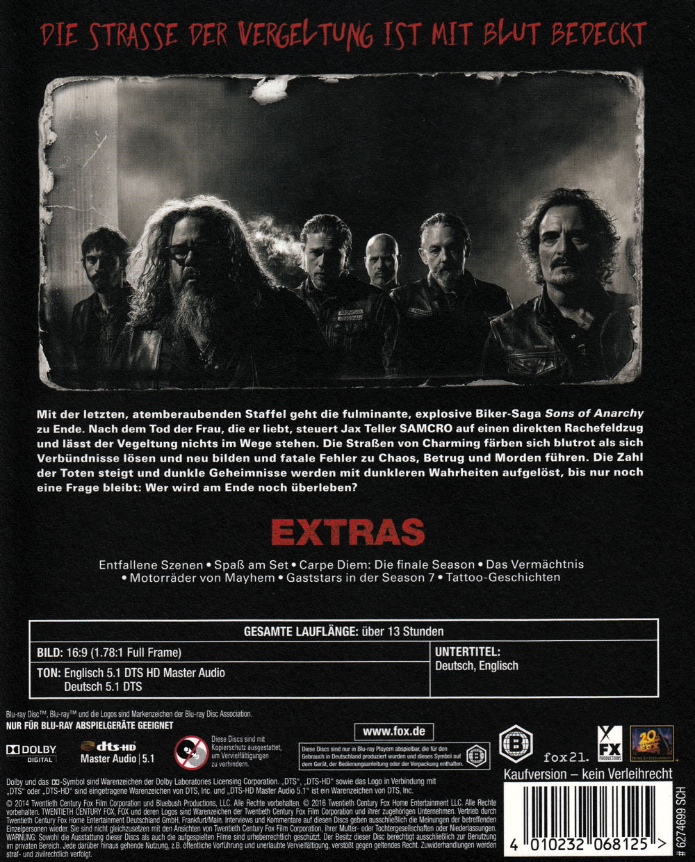 Nach dem Tod der Frau, die er liebt, steuert Jax Teller SAMCRO auf einen direkten Rachefeldzug und lässt der Vegeltung nichts im Wege stehen. Die Straßen von Charming färben sich blutrot als sich Verbündnisse lösen und neu bilden und fatale Fehler zu Chaos, Betrug und Morden führen. Die Zahl der Toten steigt und dunkle Geheimnisse werden mit dunkleren Wahrheiten aufgelöst, bis nur noch eine Frage bleibt: Wer wird am Ende noch überleben?