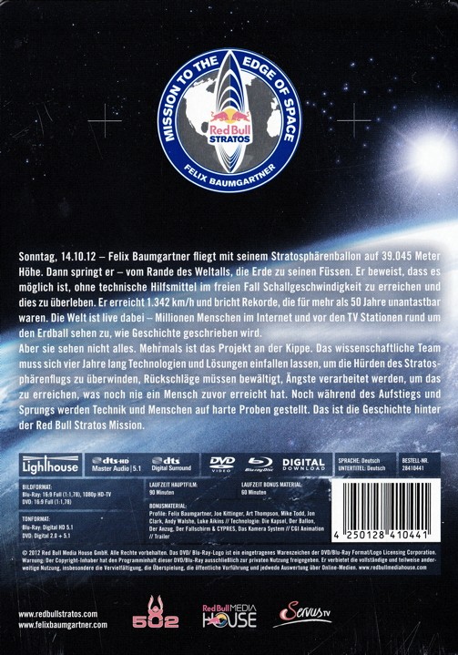 Sonntag, 14.10.12 – Felix Baumgartner fliegt mit seinem Stratosphärenballon auf 39.045 Meter Höhe. Dann springt er - vom Rande des Weltalls, die Erde zu seinen Füssen. Er beweist, dass es möglich ist, ohne technische Hilfsmittel im freien Fall Schallgeschwindigkeit zu erreichen und dies zu überleben. Er erreicht 1.342 km/h und bricht Rekorde, die für mehr als 50 Jahre unantastbar waren. Die Welt ist live dabei - Millionen Menschen im Internet und vor den TV Stationen rund um den Erdball sehen zu, wie Geschichte geschrieben wird. Aber sie sehen nicht alles. Mehrmals ist das Projekt an der Kippe. Das wissenschaftliche Team muss sich vier Jahre lang Technologien und Lösungen einfallen lassen, um die Hürden des Stratosphärenflugs zu überwinden, Rückschläge müssen bewältigt, Ängste verarbeitet werden, um das zu erreichen, was noch nie ein Mensch zuvor erreicht hat. Noch während des Aufstiegs und Sprungs werden Technik und Menschen auf harte Proben gestellt. Das ist die Geschichte hinter der Red Bull Stratos Mission.