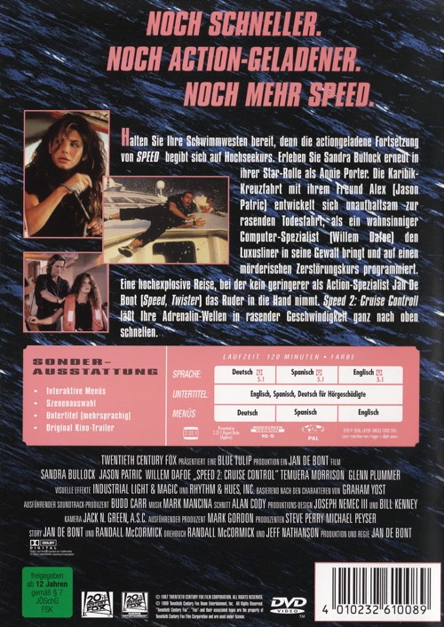 Halten Sie ihre Schwimmwesten bereit, denn die actiongeladene Fortsetzung von Speed begibt sich auf Hochseekurs. Erleben Sie Sandra Bullock erneut in ihrer Star-Rolle als Annie Porter. Die Karibik-Kreuzfahrt mit ihrem Freund Alex entwickelt sich unaufhaltsam zur rasenden Todesfahrt, als ein wahnsinniger Computer-Spezialist den Luxusliner in seine Gewalt bringt und auf einen mörderischen Zerstörungskurs programmiert. Eine hochexplosive Reise, bei der kein geringerer als Action-Spezialist Jan De Bont das Ruder in die Hand nimmt.