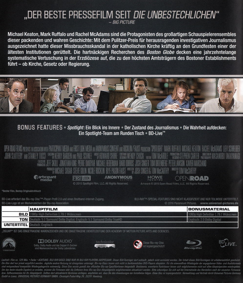 Michael Keaton, Mark Ruffalo, Rachel McAdams, Liev Schreiber, Stanley Tucci, John Slattery, Brian d'Arcy James, Billy Crudup, Neal Huff, Jamey Sheridan...Elena Wohl, Gene Amoroso, Doug Murray, Duane Murray, Sharon McFarlane, Robert B. Kennedy, Brian Chamberlain
