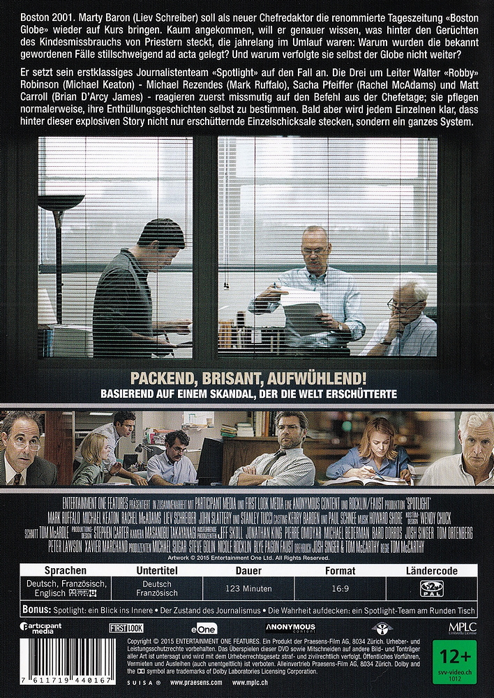 Michael Keaton, Mark Ruffalo, Rachel McAdams, Liev Schreiber, Stanley Tucci, John Slattery, Brian d'Arcy James, Billy Crudup, Neal Huff, Jamey Sheridan...Elena Wohl, Gene Amoroso, Doug Murray, Duane Murray, Sharon McFarlane, Robert B. Kennedy, Brian Chamberlain
