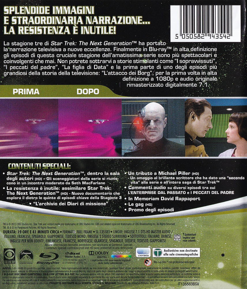 La stagione tre di Star Trek: The Next GenerationTM ha portato la'narrazione televisiva a nuove eccellenze. Finalmente in Blu-rayTM in alta definizione gli episodi di questa cruciale stagione dell'amatissima serie sono più spettacolari e coinvolgenti che mai. Non potrete sottrarvi a storie stimolanti come "I sopravvissuti",