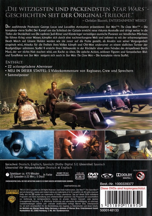 Der ausführende Produzent George Lucas und Lucasfilm Animation präsentieren Star Wars: The Clone Wars - Die komplette vierte Staffel. Der Kampf um das Schicksal der Galaxie erreicht neue riskante Ausmasse und dringt weiter in die Tiefen der Dunkelheit vor. Die tapferen Jedi-Ritter und Klonkrieger verteidigen exotische Planeten vor feindlichen Mächten. Sie führen Krieg unter Wasser, kämpfen sich durch eine nachtverhangene Welt und nehmen es mit der erbarmungslosen Death Watch auf. Unsere Helden werden wie zuvor auf die Probe gestellt, als Anakin von seiner Vergangenheit eingeholt wird, Ahsoka für die Freiheit ihres Volkes kämpft und Obi-Wan undercover an einem tödlichen Turnier der Kopfgeldjäger teilnimmt. Staffel 4 erreicht ihren Höhepunkt in der Rückkehr eines alten Feindes: des skrupellosen Darth Maul, der vor nichts Halt machen wird, um Rache zu üben.
