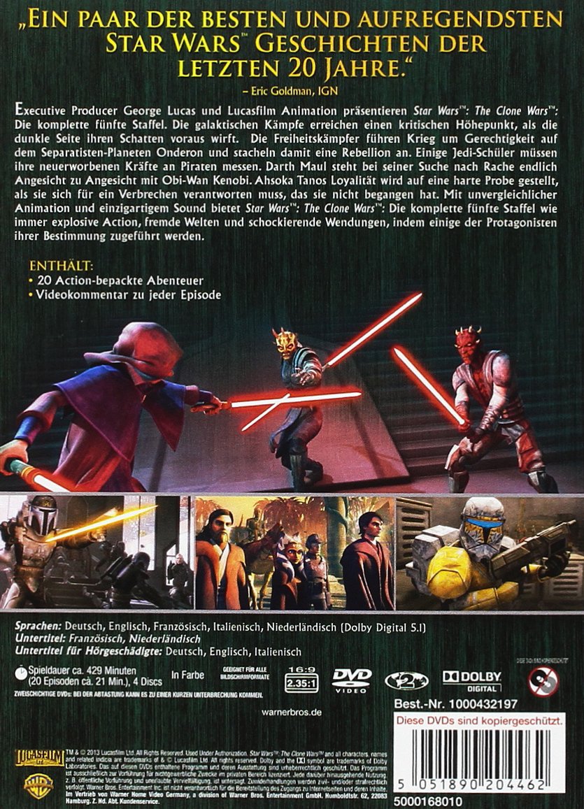 Die galaktischen Kämpfe erreichen einen kritischen Höhepunkt, als die Dunkle Seite ihren Schatten voraus wirft. Die Freiheitskämpfer führen Krieg um Gerechtigkeit auf dem Separatisten-Planeten Onderon und stacheln damit eine Rebellion an. Einige Jedi-Schüler müssen ihre neuerworbenen Kräfte an Piraten messen. Darth Maul steht bei seiner Suche nach Rache endlich Angesicht zu Angesicht mit Obi-Wan Kenobi. Ahsoka Tanos Loyalität wird auf eine harte Probe gestellt, als sie sich für ein Verbrechen verantworten muss, das sie nicht begangen hat. Mit unvergleichlicher Animation und einzigartigem Sound bietet Star Wars: The Clone Wars: Die komplette fünfte Staffel wie immer explosive Action, fremde Welten und schockierende Wendungen, indem einige der Protagonisten ihrer Bestimmung zugeführt werden.