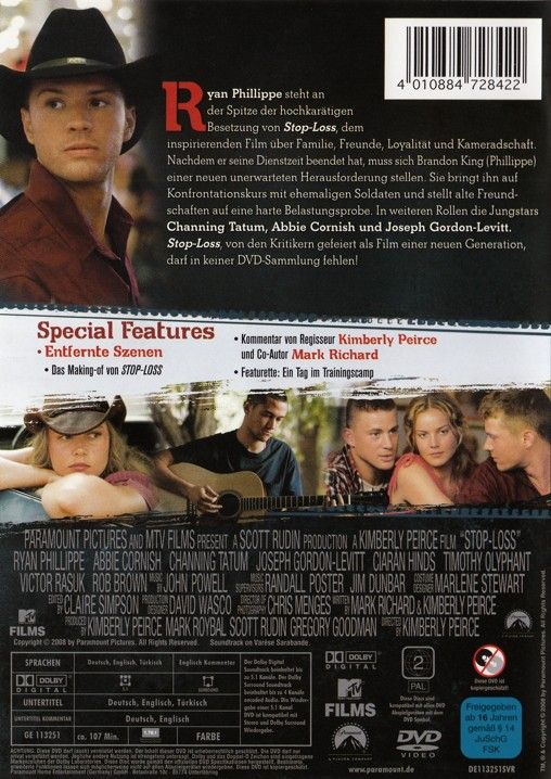Ryan Phillippe steht an der Spitze der hochkarätigen Besetzung von Stop-Loss, dem inspirierenden Film über Familie, Freunde, Loyalität und Kameradschaft. Nachdem er seine Dienstzeit beendet hat, muss sich Brandon King (Phillippe) einer neuen unerwarteten Herausforderung stellen. Sie bringt ihn auf Konfrontationskurs mit ehemaligen Soldaten und stellt alte Freundschaften auf eine harte Belastungsprobe. In weiteren Rollen die Jungstars Channing Tatum, Abbie Cornish und Joseph Gordon-Levitt. Stop-Loss, von den Kritikern gefeiert als Film einer neuen Generation, darf in keiner DVD-Sammlung fehlen!