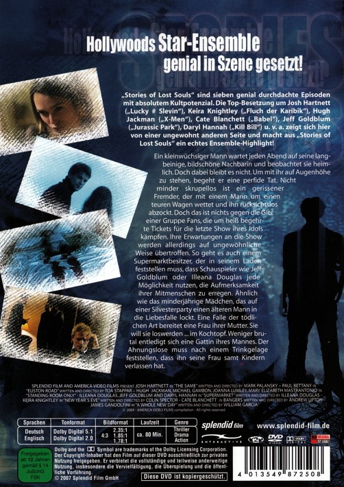 "Storys of lost Souls" sind sieben genial durchdachte Episoden mit absolutem Kultpotenzial. Die Top-Besetzung von Josh Hartnett, Keira Knightley, Hugh Jackman, Cate Blanchett, Jeff Goldblum, Daryl Hannah u. v. a. zeigt sich hier von einer ungewohnt anderen Seite und macht aus "Storys of lost Souls" ein echtes Ensemble-Highlight!
