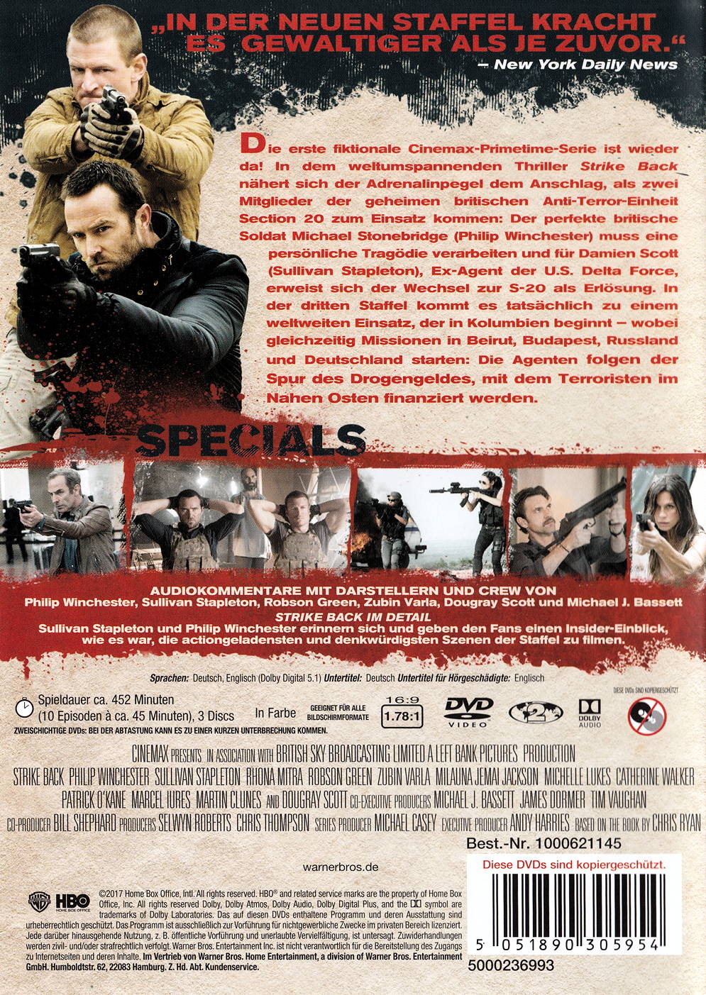 In dem weltumspannenden Thriller Strike Back nähert sich der Adrenalinpegel dem Anschlag, als zwei Mitglieder der geheimen britischen Anti-Terror-Einheit Section 20 zum Einsatz kommen: Der perfekte britische Soldat Michael Stonebridge muss eine persönliche Tragödie verarbeiten, und für Damien Scott, Ex-Agent der U.S. Delta Force, erweist sich der Wechsel zu S-20 als Erlösung. In der dritten Staffel kommt es tatsächlich zu einem weltweiten Einsatz, der in Kolumbien beginnt - wobei gleichzeitig Missionen in Beirut, Budapest, Russland und Deutschland starten: Die Agenten folgen der Spur des Drogengeldes, mit dem Terroristen im Nahen Osten finanziert werden.