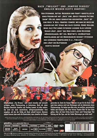 Rob Stefaniuk, Autor, Regisseur und Haupt-darsteller in einer Person hat mit 'Suck' eine 'Rocky Horror Picture Show' für die junge Generation geschaffen. 'Suck' ist eine Rock-'n'- Roll-Vampire-Comedy, wie man sie noch nie gesehen hat. Mit Stars wie Alice Cooper, Henry Rollins, Moby, Iggy Pop sowie Gitarren-Legende Alex Lifeson (Rush) lässt 'Suck' das Herz eines jeden Rockfans höherschlagen. Mit viel Wortwitz und großartigen Anspielungen auf die Musikbranche beendet Stefaniuk das schmusige Vampirleben à la 'Twilight' und läst die Blutsauger richtig rocken!