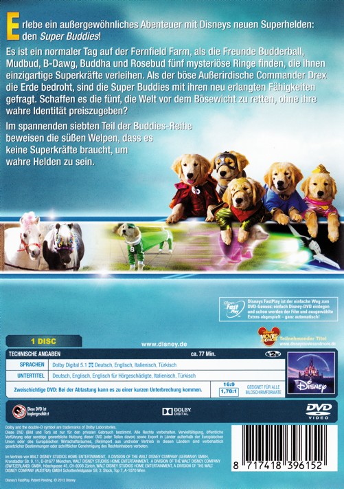 Es ist ein normaler Tag auf der Fernfi eld Farm, als die Freunde Budderball, Mudbud, B-Dawg, Buddha und Rosebud fünf mysteriöse Ringe finden, die ihnen einzigartige Superkräfte verleihen. Als der böse ausserirdische Commander Drex die Erde bedroht, sind die Super Buddies mit ihren neu erlangten Fähigkeiten gefragt. Schaffen es die fünf, die Welt vor dem Bösewicht zu retten, ohne ihre wahre Identität preiszugeben? Im spannenden siebten Teil der Buddies-Reihe beweisen die süssen Welpen, dass es keine Superkräfte braucht, um wahre Helden zu sein.