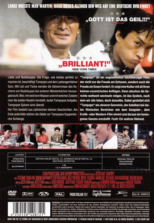 Der Episodenfilm aus dem Jahr 1985 beschäftigt sich vordergründig mit Essen und deren Darstellung, ist jedoch eindeutig tiefsinniger, da es auch um Liebe und Tod und den ewigen Kreislauf des Lebens geht. "Tampopo" ist ein ungewöhnlich leichtherziger Film, der nicht nur die Freude am Schauen, sondern auch die Freude am Essen fordert. Er zeigt eine Kultur mit all ihren kleinen exzentrischen Anflügen und bietet damit doch nur den Blick in den Spiegel. Denn obschon die Gerichte weltweit wechseln mögen, ist das System, nach dem wir alle leben, doch dasselbe. Dabei gestaltet sich "Tampopo" als cleverer Genremix, der Anleihen bei vielen filmischen Bereichen wie dem Gangster-, dem Erotik- oder Western-Film nimmt und daraus ein homogenes Ganzes erschafft. Fazit: Ein wahres Kleinod.