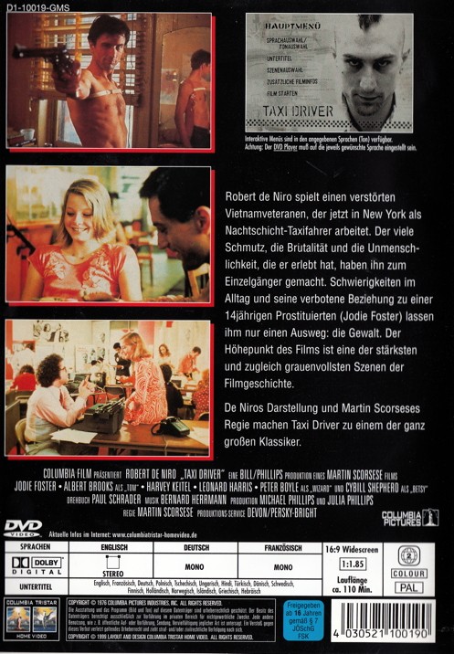 Robert de Niro spielt einen verstörten Vietnamveteranen, der jetzt in New York als Nachtschicht-Taxifahrer arbeitet. Der viele Schmutz, die Brutalität und die Unmenschlichkeit, die er erlebt hat, haben ihn zum Einzelgänger gemacht. Schwierigkeiten im Alltag und seine verbotene Beziehung zu einer 14-jährigen Prostituierten lassen ihm nur einen Ausweg: die Gewalt. Der Höhepunkt des Films ist eine der stärksten und zugleich grauenvollsten Szenen der Filmgeschichte.