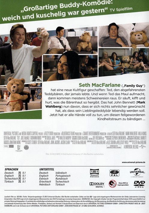 Ted ist der abgefahrenste Teddybär, der je über die Leinwand flimmerte. Ted kann sprechen, was nicht selten in kräftiges Fluchen ausartet, er säuft, kifft und hurt, was die Bärenhaut so hergibt. Das hat John Bennett (Mark Wahlberg) nun davon, dass er sich nichts sehnlicher gewünscht hat, als dass sein Lieblingsteddybär lebendig werden soll. Jetzt hat er alle Hände voll zu tun, um diesen fellgewordenen Kindheitstraum zu bändigen...