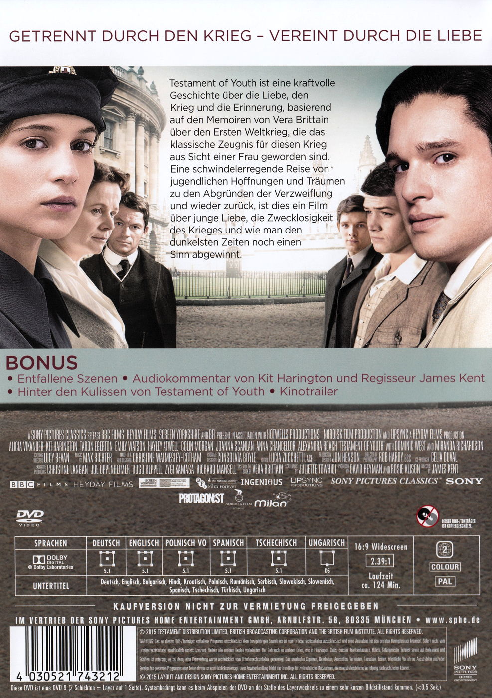 Testament of Youth ist eine kraftvolle Geschichte über die Liebe, den Krieg und die Erinnerung, basierend auf den Memoiren von Vera Brittain über den Ersten Weltkrieg, die das klassische Zeugnis für diesen Krieg aus Sicht einer Frau geworden sind. Eine schwindelerregende Reise von jugendlichen Hoffnungen und Träumen zu den Abgründen der Verzweiflung und wieder zurück, ist dies ein Film über junge Liebe, die Zwecklosigkeit des Krieges und wie man den dunkelsten Zeiten noch einen Sinn abgewinnt.