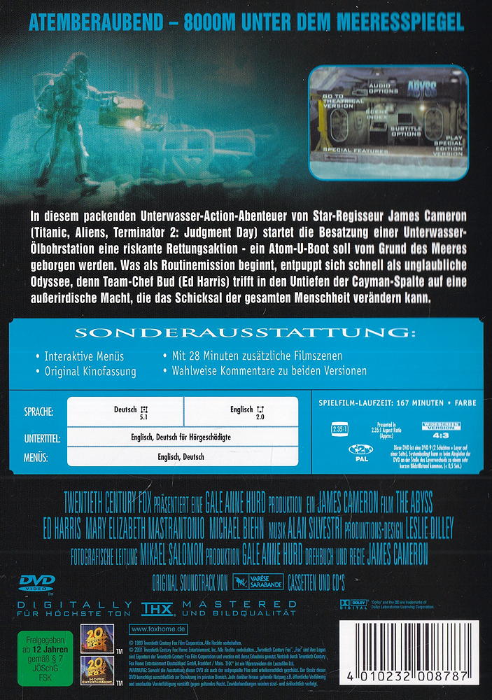 In diesem packenden Unterwasser-Action-Abenteuer von Star-Regisseur James Cameron (Titanic, Aliens, Terminator 2: Judgment Day) startet die Besatzung einer Unterwasser-Ölbohrstation eine riskante Rettungsaktion - ein Atom-U-Boot soll vom Grund des Meeres geborgen werden. Was als Routinemission beginnt, entpuppt sich schnell als unglaubliche Odyssee, denn Team-Chef Bud (Ed Harris) trifft in den Untiefen der Cayman-Spalte auf eine ausserirdische Macht, die das Schicksal der gesamten Menschheit verändern kann.