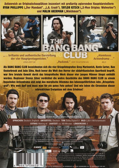 Als Bang Bang Club bezeichneten sich die vier Kriegsfotografen Greg Marinovich,Kevin Carter,Ken Oosterbroeck und Joao Silva.Noch bevor die Welt den Horror der suedafrikanischen Apartheid begriff,war ihre brutale Gewalt durch das fotografische Werk dieser vier jungen Maenner laengst enthuellt worden.Regisseur Steven Silver verdichtet die wahre Geschichte des Bang Bang Club zu einem fesselnden Actiondrama und zeigt das moralische Dilemma des lebensgefaehrlichen Jobs "Kriegsfotograf":Wie weit darf und muss man fuer ein gutes Foto gehen?Und wie leben die Chronisten dieser schrecklichen Ereignisse mit dem Erlebten?