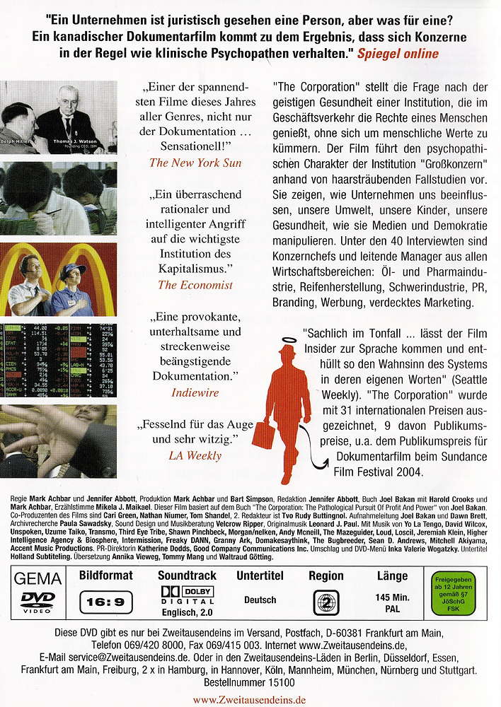 The Corporation stellt die Frage nach der geistigen Gesundheit einer Institution, die im Geschäftsverkehr die Rechte eines Menschen geniesst, ohne sich um menschliche Werte zu kümmern. Der Film führt den psychopathischen Charakter der Institution "Grosskonzern" anhand von haarsträubenden Fallstudien vor. Sie zeigen, wie Unternehmen uns beeinflussen, unsere Umwelt, unsere Kinder, unsere Gesundheit, wie sie Medien und Demokratie manipulieren. Unter den 40 Interviewten sind Konzernchefs und leitende Manager aus allen Wirtschaftsbereichen: Öl- und Pharmaindustrie, Reifenherstellung, Schwerindustrie, PR, Branding, Werbung, verdecktes Marketing.