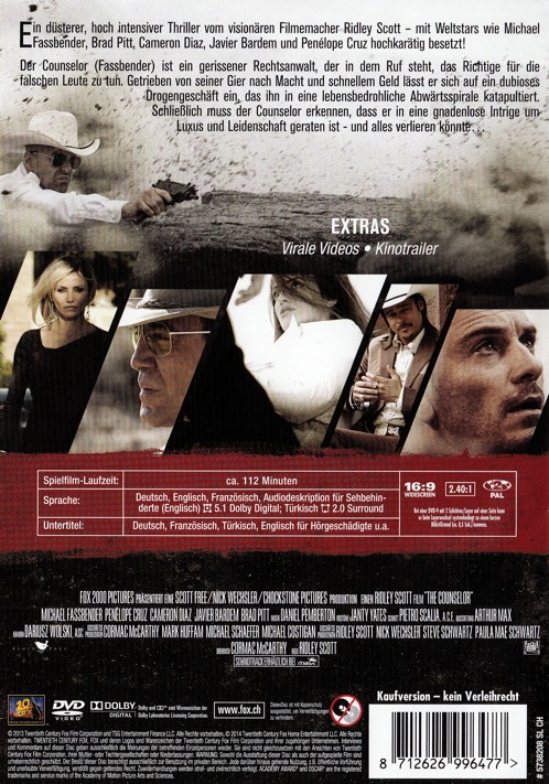 Michael Fassbender spielt den COUNSELOR, einen Rechtsanwalt, der sich, verblendet von der Gier nach Macht und Geld, durch ein illegales Drogengeschäft mit fatalen Folgen in eine lebensbedrohliche Abwärtsspirale katapultiert. Das Zusammenspiel von Intrige und folgenschwerer Entscheidung zieht ihn an einen nie erahnten Abgrund.