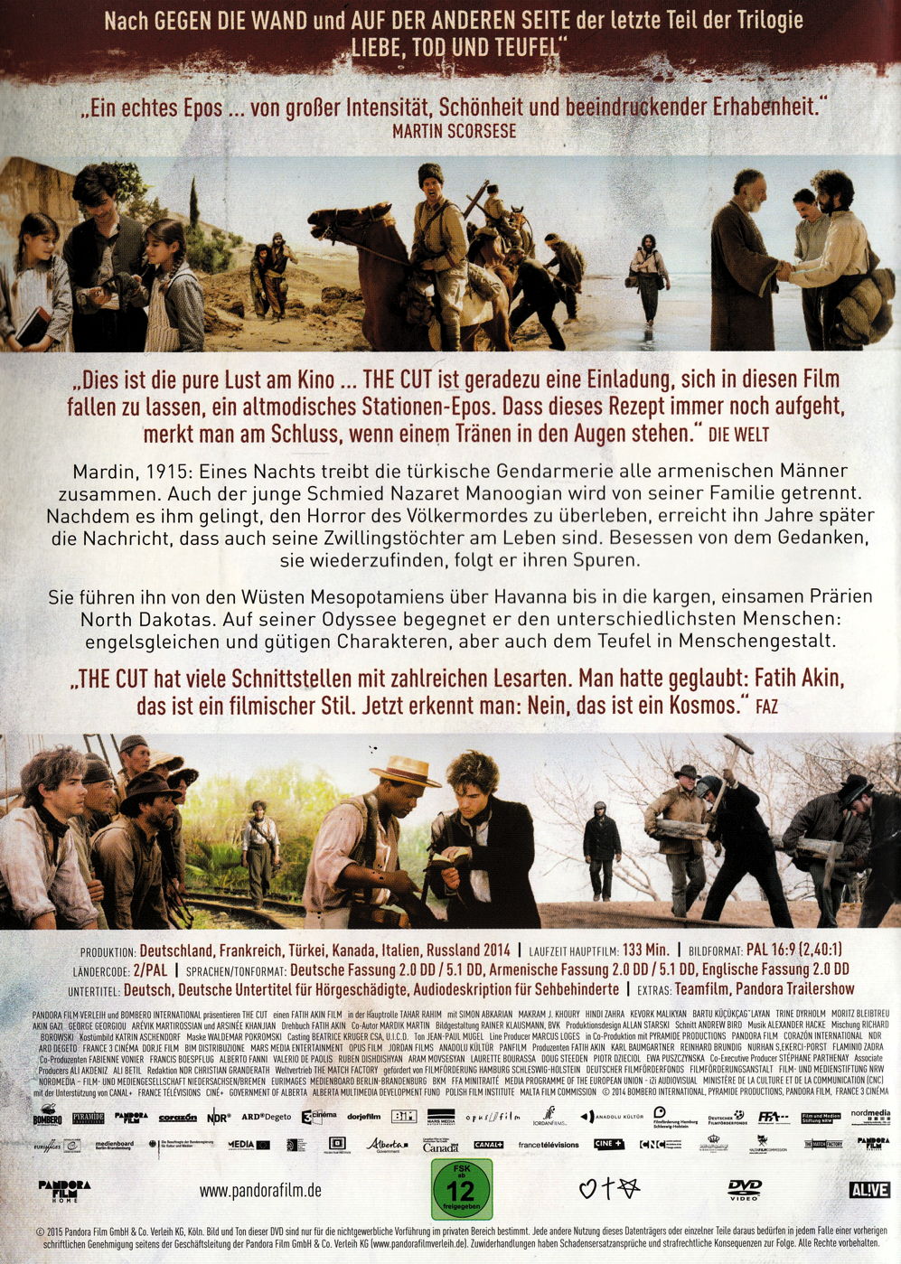 Mardin, 1915: Eines Nachts treibt die türkische Gendarmerie alle armenischen Männer zusammen. Auch der junge Schmied Nazaret Manoogian wird von seiner Familie getrennt. Nachdem es ihm gelingt, den Horror des Völkermordes zu überleben, erreicht ihn Jahre später die Nachricht, dass auch seine Zwillingstöchter am Leben sind. Besessen von dem Gedanken sie wiederzufinden, folgt er ihren Spuren. Sie führen ihn von den Wüsten Mesopotamiens über Havanna bis in die kargen, einsamen Prärien North Dakotas. Auf seiner Odyssee begegnet er den unterschiedlichsten Menschen: Engelsgleichen und gütigen Charakteren, aber auch dem Teufel in Menschengestalt. THE CUT ist Epos, Drama, Abenteuerfilm und Western zugleich. Obwohl der Film die Welt vor 100 Jahren beschreibt, ist er brandaktuell, denn er erzählt von Krieg und Vertreibung. Aber auch von der Kraft der Liebe und der Hoffnung, die uns Unvorstellbares leisten lässt.