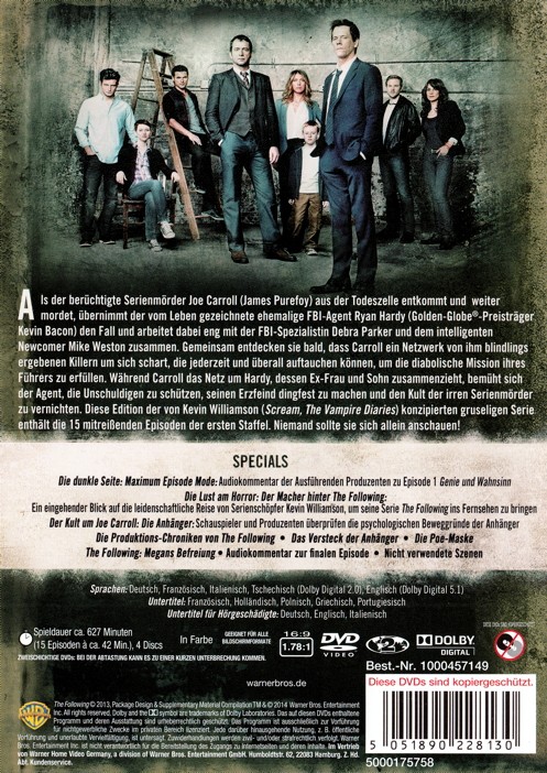 Als der berüchtigte Serienmörder Joe Carroll (James Purefoy) aus der Todeszelle entkommt und weiter mordet, übernimmt der vom Leben gezeichnete ehemalige FBI-Agent Ryan Hardy (Golden-Globe®-Preisträger Kevin Bacon) den Fall und arbeitet dabei eng mit der FBI-Spezialistin Debra Parker und dem intelligenten Newcomer Mike Weston zusammen. Gemeinsam entdecken sie bald, dass Carroll ein Netzwerk von ihm blindlings ergebenen Killern um sich schart, die jederzeit und überall auftauchen können, um die diabolische Mission ihres Führers zu erfüllen. Während Carroll das Netz um Hardy, dessen Ex-Frau und Sohn zusammenzieht, bemüht sich der Agent, die Unschuldigen zu schützen, seinen Erzfeind dingfest zu machen und den Kult der irren Serienmörder zu vernichten. Diese Edition der von Kevin Williamson (Scream, The Vampire Diaries) konzipierten gruseligen Serie enthält die 15 mitreissenden Episoden der ersten Staffel. Niemand sollte sie sich allein anschauen.