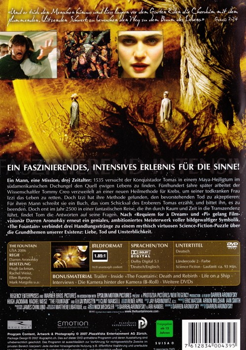 Ein Mann, eine Mission, drei Zeitalter: 1535 versucht der Konquistador Tomas in einem Maya-Heiligtum im südamerikanischen Dschungel den Quell ewigen Lebens zu finden. Fünfhundert Jahre später arbeitet der Wissenschaftler Tommy Creo verzweifelt an einer neuen Heilmethode für Krebs, um seiner todkranken Frau Izzy das Leben zu retten. Doch Izzi hat ihre Methode gefunden, den bevorstehenden Tod zu akzeptieren: Für ihren Mann schreibt sie ein Buch, das vom Schicksal des Eroberers Tomas erzählt und bittet ihn, es zu beenden. Doch erst im Jahr 2500 in einer fantastischen Reise, die ihn durch Raum und Zeit in die Transzendenz führt, findet Tom die Antwort auf seine Fragen.