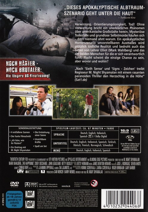 Verwirrung, Orientierungslosigkeit, Tod! Ohne Vorwarnung bricht ein unerklärliches Phänomen über amerikanische Grossstädte herein. Mysteriöse Todesfälle und grundlose Selbstmorde häufen sich - doch niemand ahnt warum. Ein apokalyptisches Horrorszenario unvorstellberen Ausmasses wird plötzlich tödliche Realität und bedroht auch das Leben von Lehrer Elliot (Mark Wahlberg) und das der beiden Menschen für die er sich verantwortlich fühlt. Flucht scheint die einzige Chance zu sein, aber wovor und wohin?