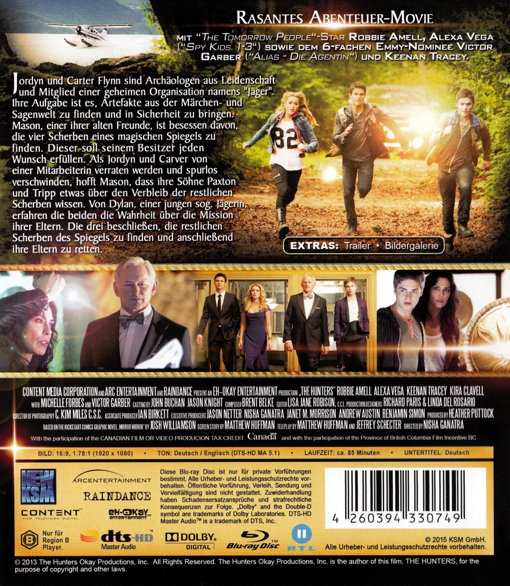 Indiana Jones meets Lara Croft! So kurz und knackig ließe sich das rasant erzählte Abenteuer-Movie The Hunters - Auf der Jagd nach dem verlorenen Spiegel beschreiben. Ein wesentlicher Unterschied besteht jedoch darin, dass sich hier nicht gestandene Erwachsene oder alternde Archäologen auf die Jagd nach den wichtigsten Artefakten begeben, sondern hier weht frischer, jugendlicher Wind ! Hier tritt die neue Garde an, Indiana Jones reloaded sozusagen.... Und so entstand im Jahre 2013 unter der Regie von Nisha Ganatra ( Wedding Bells , Immer wieder Weihnachten ) dieser Abenteuerfilm, der mit Robbie Amell und Alexa PenaVega, den Stars aus der genialen Sci-Fi-Serie The Tomorrow People und Victor Gaber, 6-facher Emmy-Nominee, bekannt aus Argo von Ben Affleck und der erfolgreichen TV-Serie Alias - Die Agentin zur spannenden Story auch noch eine feine Besetzung bietet. Und so sind Jordyn (Michelle Forbes, The Killing , Battlestar Galactica) und Carter Flynn (Dan Pyne, Watchmen: Die Wächter , The Cabin in the Woods ) in The Hunters - Auf der Jagd nach dem verlorenen Spiegel Archäologen aus Leidenschaft und Mitglied einer geheimen Organisation namens Jäger . Ihre Aufgabe besteht darin, Artefakte aus der Märchen- und Sagenwelt zu finden und in Sicherheit zu bringen. Mason (Victor Garber), einer ihrer alten Freunde, ist besessen davon, die vier Scherben eines magischen Spiegels zu finden. Dieser soll seinem Besitzer jeden Wunsch erfüllen. Als Jordyn und Carver jedoch von einer Mitarbeiterin verraten werden und spurlos verschwinden, hofft Mason, dass ihre Söhne Paxton (Robbie Amell) und Tripp (Keenan Tracey, Der 16. Wunsch , Rags ) etwas über den Verbleib der restlichen Scherben wissen. Von Dylan (Alexa PenaVega), einer jungen Jägerin , erfahren die beiden dann die Wahrheit über die Mission ihrer Eltern. Daraufhin beschließen die drei, die restlichen Scherben des Spiegels zu finden und anschließend gemeinsam ihre Eltern zu retten. Und so eilen sie in die Rocky Mountains, um die drei noch versteckten Spiegelteile vor den diversen Kontrahenten sicherzustellen. Auf welch gefährliche Mission sich die jungen Erben von Indiana Jones da eingelassen haben, wird ihnen jedoch ganz schnell klar. Denn ihre Widersacher kämpfen mit allen Mitteln, um den Spiegel zuerst in ihre Hände zu bekommen...