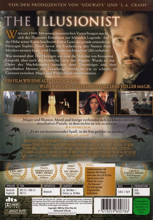 Wien um 1900: Mit seinen fantastischen Vorstellungen macht sich der Illusionist Eisenheim zur lebenden Legende. Auf der Höhe seiner Kunst beschwört er den Geist der gerade ermordeten Herzogin Sophie. Doch bevor die Erscheinung den Namen ihres Mörders nennen kann, wird Eisenheim von Inspektor Uhl verhaftet. Was niemand ahnt: Die Herzogin war zwar die Verlobte von Kronprinz Leopold, aber auch die heimliche Liebe des Magiers. Wurde sie das Opfer des Machtkampfes zwischen dem Thronfolger und dem rätselhaften Meister der Täuschung? Nichts ist wie es scheint, die Grenzen zwischen Magie und Wirklichkeit verschwimmen...