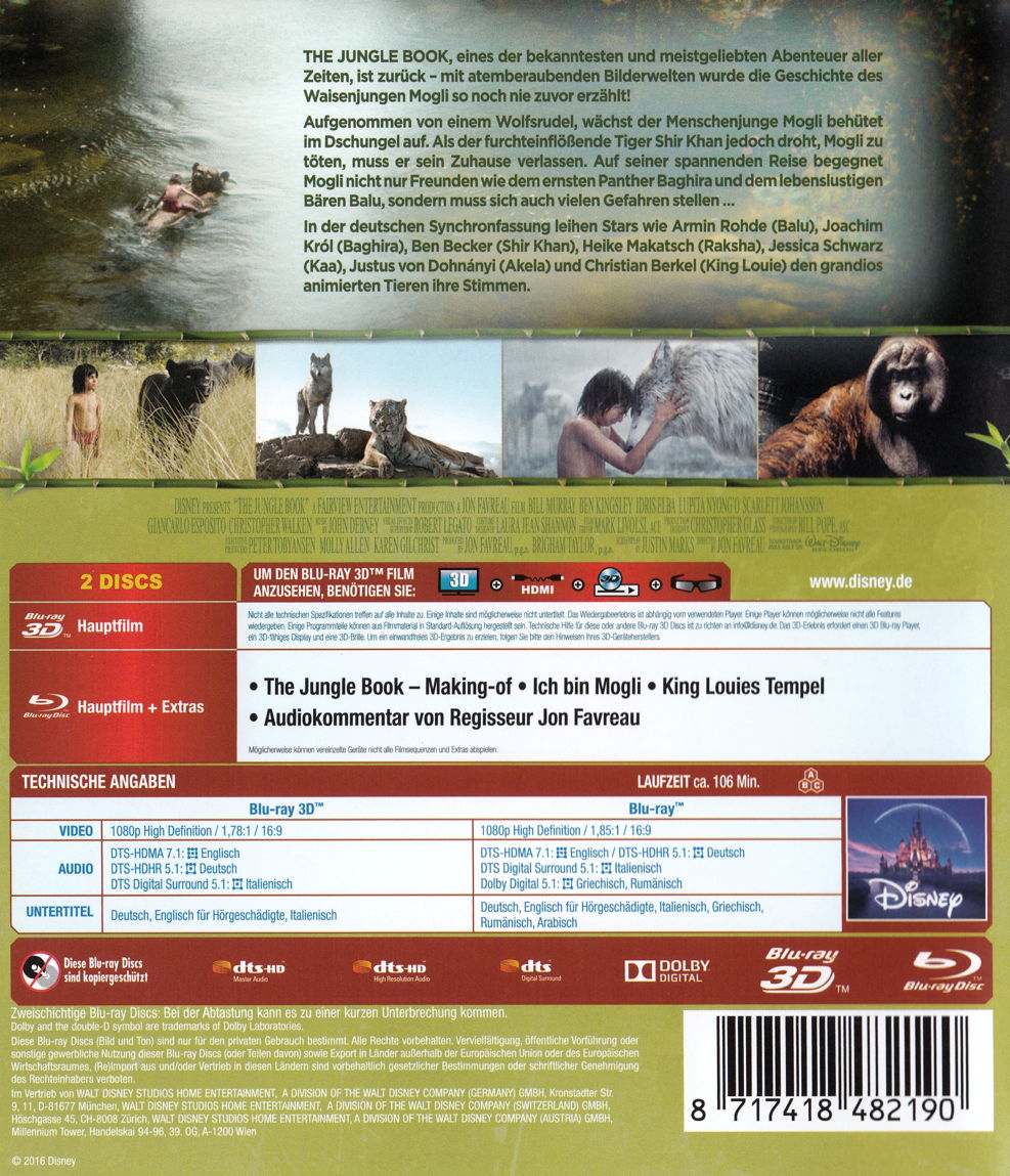 Mit "The Jungle Book" kehrt eines der bekanntesten Abenteuer aller Zeiten auf die grosse Kinoleinwand zurück und erzählt eine vertraute Geschichte auf imposante und überraschend andere Art und Weise. Der vom Schicksal gezeichnete Waisenjunge Mogli findet Zuflucht bei einem Wolfsrudel und lernt im Dschungel zu überleben. Bis der mächtige Tiger Shir Khan davon erfährt, der geschworen hat, jegliche menschliche Bedrohung zu vernichten, um die Gesetze des Dschungels zu wahren. Nun muss Mogli das einzige Zuhause, dass er je kannte, verlassen und sich auf eine gefahrenvolle Reise begeben. In Begleitung seines strengen Mentors Baghira und des lebhaften Bärs Balu macht er sich auf, den Weg zurück zu den Menschen zu finden. Doch Mogli erkennt, dass seine Stärke nicht nur in ihm selbst sondern auch in seiner Verbundenheit mit dem Dschungel liegt und trifft eine folgenschwere Entscheidung...