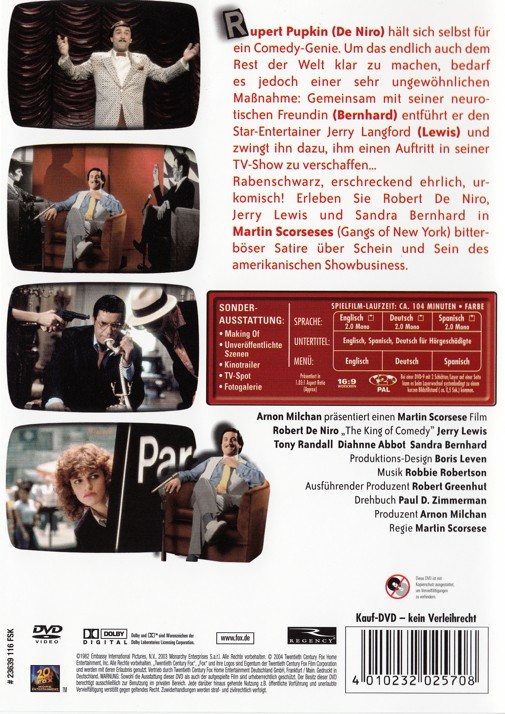 "Rupert Pupkin (De Niro) hält sich selbst für ein Comedy-Genie. Um das endlich auch dem Rest der Welt klar zu machen, bedarf es jedoch einer sehr ungewöhnlichen Maßnahme: Gemeinsam mit seiner neurotischen Freundin (Bernhard) entführt er den Star-Entertainer Jerry Langford (Lewis) und zwingt ihn dazu, ihm einen Auftritt in seiner TV-Show zu verschaffen..."