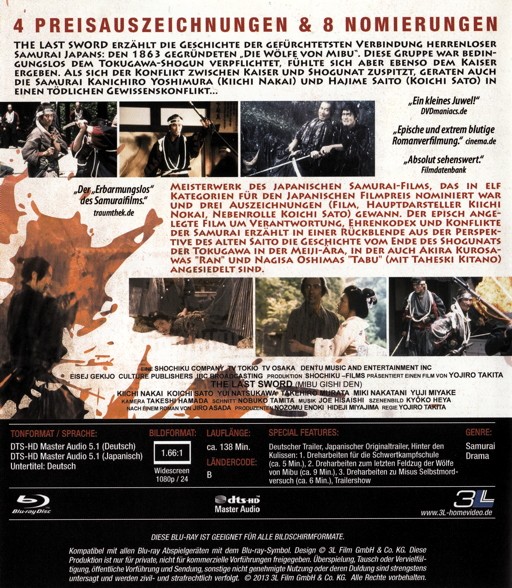 The Last Sword erzählt in epischen Bildern die Geschichte der gefürchtesten Verbindung herrenloser Samurai Japans: den 1863 gegründeten "Shinzengummi, die im Volksmund auch "Die Wölfe von Mibu" genannt wurden. Diese Gruppe war bedingungslos dem Tokugawa-Shogun verpflichtet, fühlte sich aber ebenso dem Kaiser ergeben. Als der Konflikt zwischen Kaiser und Shogunat prekärer wird, geraten auch die Samurai Kainchiro Yoshimura und Hajime Saito in den Strudel der Ereignisse...