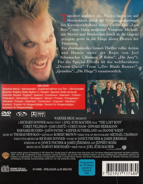 Jason Patric, Kiefer Sutherland, Dianne Wiest, Corey Haim, Jami Gertz, Corey Feldman, Tony Cain, Melanie Bishop, Sandra E. Garcia, Kelly Jo Minter...Timmy Cappello, Jim Turner, Peggy Malone, Mercedes Moseley, Nicole Vigil, Douglas Mellor, J. Dinan Myrtetus, Jane Bare, Inez Pandalfi, Ian Guindon, Christopher Peters, Brooke McCarter, Billy Wirth, Jamison Newlander, Edward Herrmann, Barnard Hughes, Alex Winter, Chance Michael Corbitt, Keith Butterfield, Gerald Younggren, Todd Feder, Nori Morgan, Alexander Bacon Chapman, Eric Graves