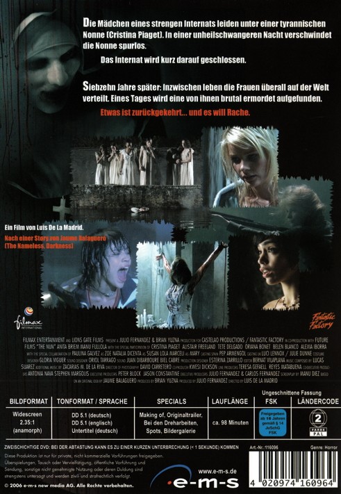Die Mutter von Eva ist verstorben. Bei einem Haushaltsunfall, glaubt die Polizei, durch die Hand einer aus Leitungswasser materialisierten Killernonne, wie Eva zu sehen glaubte. Nun stellt sich heraus, dass ihre Mutter einst in einer gestrengen spanischen Klosterschule unterrichtet wurde. Eva gedenkt, Licht in die Angelegenheit zu bringen. In Spanien stösst sie auf Mitschülerinnen ihrer Mutter, die sich seit neustem alle sehr unsicher fühlen. Mit gutem Grund, wie sich bald auf drastische Weise heraus stellt.