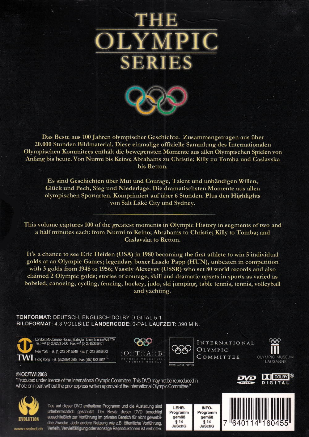 Das Beste aus 100 Jahren olympischer Geschichte. Zusammengetragen aus über 20.000 Stunden Bildmaterial. Diese weltweite einmalige offizielle Sammlung des Internationalen Olympischen Kommitees auf DVD enthält die bewegensten Momente aus allen Olympischen Spielen von Anfang bis heute. Von Nurmi bis Keino; Abrahams to Christie; Killy to Tomba und Caslavska bis Retton. Es ist die einmalige Chance alles noch einmal zu erleben: wie Eric Heiden (USA) 1980 als erster Athlet 5 Goldmedallien gewinnt. Der Boxer Laszlo Papp von 1948 - 1956 drei Goldmedallien gewinnt und ungeschlagen bleibt. Oder Vassily Alexegejew (UDSSR) 80 Weltrekorde aufstellt und zweimal Gold gewinnt etc. Es sind Geschichten über Mut und Courage, Talent und unbändigen Willen, Glück und Pech, Sieg und Niederlage. Die dramatischsten Momente aus allen olympischen Sportarten. Komprimiert auf über 6 Stunden. Plus den offiziellen Highlight Filmen von Salt Lake City und Sydney. Ein Muss für jeden Sportfan, dass in keiner Sammlung fehlen darf. 6 DVDs in einer edlen Sammlerbox. 100 Goldene Momente + den offiziellen Filmen von Salt Lake & Sidney sowie Anleitung-Booklet aller DVD.
