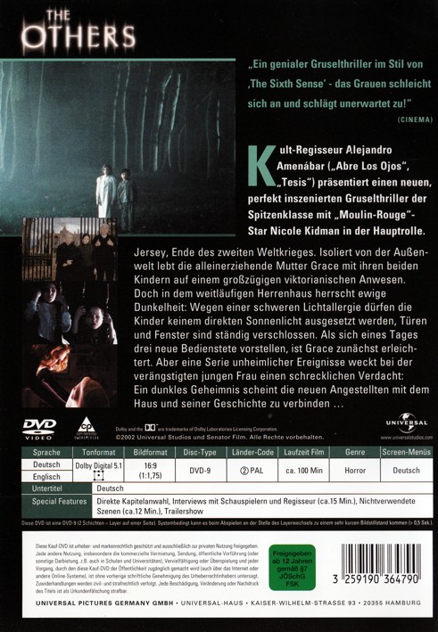 Jersey, Ende des Zweiten Weltkrieges: Isoliert von der Aussenwelt lebt die allein erziehende Mutter Grace mit ihren zwei Kindern auf einem grosszügig viktorianischen Anwesen. In dem weitläufigen Herrenhaus herrscht ewige Dunkelheit - wegen einer schweren Lichtallergie dürfen die Kinder keinem direkten Sonnenlicht ausgesetzt werden. Türen und Fenster sind ständig verschlossen. Als sich eines Tages drei neue Bedienstete vorstellen, ist Grace zunächst erleichtert. Doch eine Serie merkwürdiger Ereignisse weckt bei der verängstigten jungen Frau einen schrecklichen Verdacht: Ein dunkles Geheimnis scheint die neuen Angestellten mit dem Haus und seiner Geschichte zu verbinden...