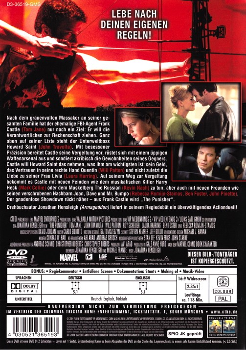 Nach dem grauenvollen Massaker an seiner gesamten Familie hat der ehemalige FBI-Agent Frank Castle (Tom Jane) nur noch ein einziges Ziel: Er will die Verantwortlichen zur Rechenschaft zu ziehen. Ganz oben auf seiner Liste ist natürlich der Mann, der den Mord an Castles Familie angeordnet hatte, der Unterweltboss Howard Saint (John Travolta). Mit besessener Präzision bereitet Castle seine Rache vor, er rüstet sich mit einem üppigen Waffenarsenal aus und sondiert akribisch die Gewohnheiten seines Gegners. Castle will Howard Saint das nehmen, was ihm am wichtigsten ist: sein Geld, das Vertrauen in seine rechte Hand Quentin (Will Patton) und nicht zuletzt natürlich die Liebe zu seiner Frau Livia (Laura Harring). Auf seinem Weg zur erlösenden Vergeltung bekommt es Frank Castle mit neuen Feinden wie dem musikalischen Killer Harry Heck (Mark Collie) oder dem Muskelberg The Russian (Kevin Nash) zu tun, aber auch mit neuen Freunden wie seinen verschrobenen Nachbarn Joan, Dave und Mr. Bumpo (Rebecca Romijn-Stamos, Ben Foster, John Pinette), die ihm zeigen, dass es für ihn auch ein Leben nach der Rache geben kann. Während der Showdown mit Howard Saint immer näher rückt, wird aus Frank Castle "The Punisher".