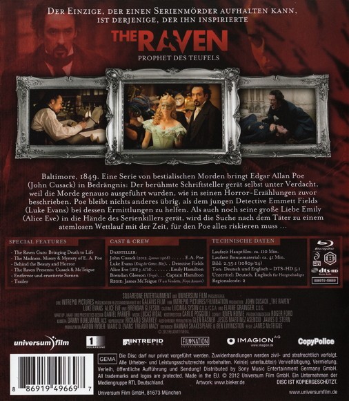 Baltimore, 1849. Eine Serie von bestialischen Morden bringt Edgar Allan Poe (John Cusack) in Bedrängnis: Der berühmte Schriftsteller gerät selbst unter Verdacht, weil die Morde genauso ausgeführt wurden, wie in seinen Horror-Erzählungen zuvor beschrieben. Poe bleibt nichts anderes übrig, als dem jungen Detective Emmett Fields (Luke Evans) bei dessen Ermittlungen zu helfen. Als auch noch seine grosse Liebe Emily (Alice Eve) in die Hände des Serienkillers gerät, wird die Suche nach dem Täter zu einem atemlosen Wettlauf mit der Zeit, für den Poe alles riskieren muss...