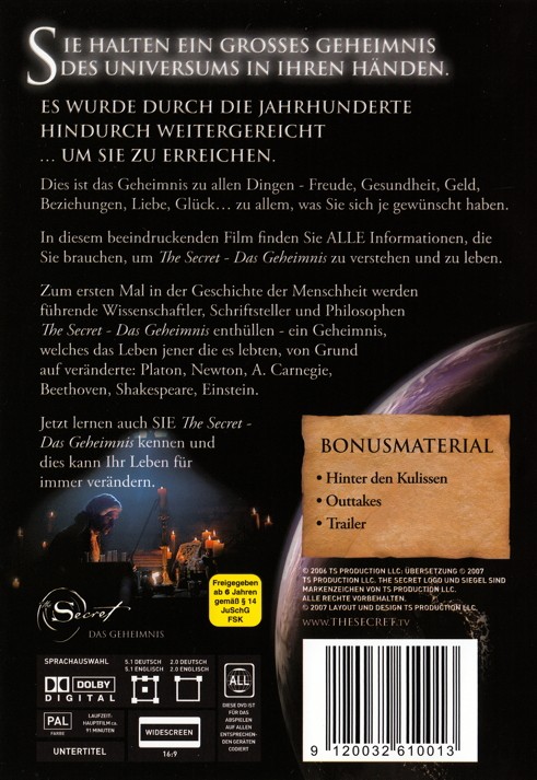 Außergewöhnliche Männer und Frauen kannten es, und sie gingen als herausragende Persönlichkeiten in die Geschichte ein: Platon, Beethoven, Leonardo da Vinci, Galileo Galilei, Napoleon, Victor Hugo, Lincoln, Edison, Einstein und Carnegie, um nur einige wenige zu nennen. Nach "What The Bleep Do We Know", der Film, der uns auf wissenschaftlicher Basis erläuterte, wie Leben funktioniert und was "wie innen so außen" bedeutet, zeigt "The Secret" uns, was wir tun können und lässt uns ins Handeln kommen. Wir sind selbst Schöpfer unserer Realität.