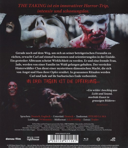 Gerade noch auf dem Weg um sich an seiner betrügerischen Freundin zur rächen, erwacht Carl auf einmal benommen und orientierungslos in der Einöde. Ein grotesker Albtraum scheint Wirklichkeit zu werden. Er und eine ihm fremde Frau, Jade, werden von einer Familie im Wald gefangen gehalten. Der verrückte Hinterwäldler-Clan dient einer mysteriösen dämonischen Macht, die sich von Angst und Hass ihrer Opfer ernährt. Mit Misshandlungen und grausamen Ritualen werden Carl und Jade auf ihr barbarisches Ende vorbereitet. In drei Tagen ist die Opferung. THE TAKING ist ein innovativer Horror Trip, visuell eindrucksvoll, intensiv und schonungslos.