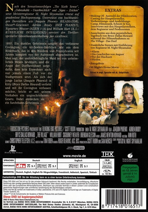 1897. Ein dunkles Geheimnis umgibt das verlassene Covington, ein 60-Seelen-Dörfchen wie aus dem Bilderbuch, das in den Wäldern von Pennsylvania seit Jahren komplett von der Aussenwelt abgeschnitten ist. Man sagt, der undurchdringliche Wald sei von unheimlichen Wesen bevölkert, und die Angst der Dorfbewohner sorgt dafür, dass kein Einwohner auch nur jemals einen Fuss vor die Stadtgrenzen setzt. Als sich der junge Lucius (Joaquin Phoenix) in Kitty (Bryce Dallas Howard) verliebt und mit ihr Covington verlassen möchte, bricht er mit seinem Vorhaben ein ungeschriebenes Gesetz. Dabei entdecken sie ein furchtbares Geheimnis...