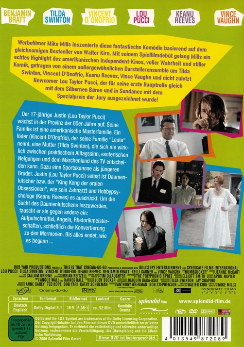 Der 17-jährige Justin wächst in der Provinz der 80-er Jahre auf. Seine Familie ist eine amerikanische Musterfamilie. Ein Vater, der seine Familie "Leute" nennt, eine Mutter, die sich nie wirklich zwischen praktischem Alltagssinn, esoterischen Neigungen und dem Märchenland des TV entscheiden kann. Dazu eine Sportskanone als jüngeren Bruder. Justin selbst ist Daumenlutscher bzw. der King Kong der oralen Obsessionen, wie sein Zahnarzt und Hobbypsychologe es ausdrückt. Um die Sucht des Daumenlutschens loszuwerden, tauscht er sie gegen andere ein: Aufputschmittel, Angeln, Rhetorikmeisterschaften, schließlich die Konvertierung zu den Mormonen. Bis alles endet, wie es begann...