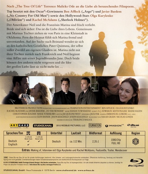Ben Affleck, Rachel McAdams, Javier Bardem, Michael Anderson, Darryl Cox, Olga Kurylenko, Jeff Anderson, Casey Williams, Romina Mondello, Ashley Clark...Charles Baker, Ginger Gilmartin, Dan Corley, Tom MacDonald, Emma Johnson, Jack Hines, Lois Boston, Tony O'Gans, Wigi Black, Tatiana Chiline, Brian Christiansen, Jamie Conner, Bobby Davis Horsley, Darren Patnode, Russell Vaclaw, Scott Mason, Danyeil Inman, Terry York, Francis Gardner, Kenneth Woodhams, Bruce Peabody, Tamar Baruch, Paris Always, Cassidee Vandalia, Samaria Folks, Amy Christiansen, Michael Bumpus, William Riddle, Russ Vaclaw, Gregg Elliott
