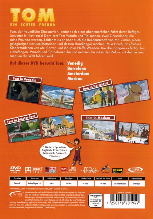 Tom, der freundliche Dinosaurier, landet nach einer abenteuerlichen Fahrt durch heftiges Unwetter in New York! Dort lernt Tom Wanda und Tip kennen, zwei Zirkuskinder, die seine Freunde werden. Leider muss er aber auch die Bekanntschaft von Mr. Carter, einem geldgierigen Karussellbetreiber, und dessen Handlanger machen: Miss Hatch, das frühere Kindermädchen von Mr. Carter, und ihr übler Neffe Weedon. Die drei bringen es fertig, Tom einzufangen. Wanda und Tip befreien ihn und nehmen ihn mit in den Zirkus, mit dem er nun rund um die Welt fahren wird.